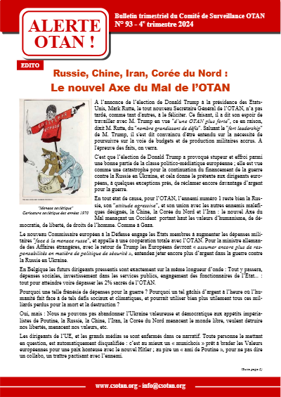 EditoRussie, Chine, Iran, Corée du Nord : Le nouvel Axe du Mal de l’OTAN Carte blanche d’associations et personnes pacifistes Comment l’Occident a amené la guerre en Ukraine Benjamin Abelow La course à la guerre Manlio Dinucci Le Parlement Européen nouveau s’en va-t-en guerre Marion Jacot-Descombes Djihadistes et sécessionnistes, les curieux alliés de l’Ukraine contre la Russie Georges Berghezan Génocides, du Viêt-Nam à Gaza Erik Rydberg La Géorgie dans le viseur de l’OTAN Roland Marounek VENEZUELA : Naissance de l’Internationale Antifasciste Claudine Pôlet Brèves