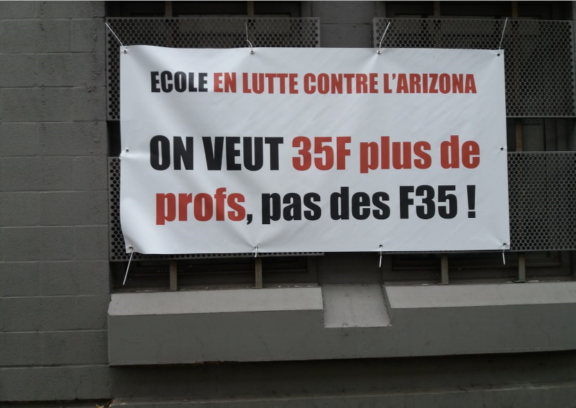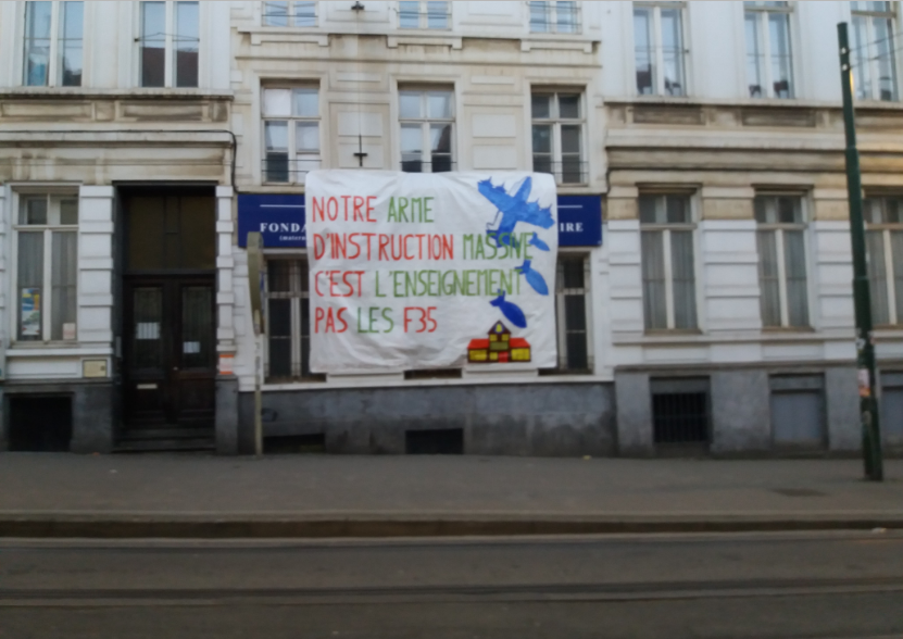 Verschillende scholen in de regio Brussel hebben spandoeken getoond waarin ze hun afwijzing uitdrukken van het militaristische beleid van de regering van Arizona (hier in St Gilles).
