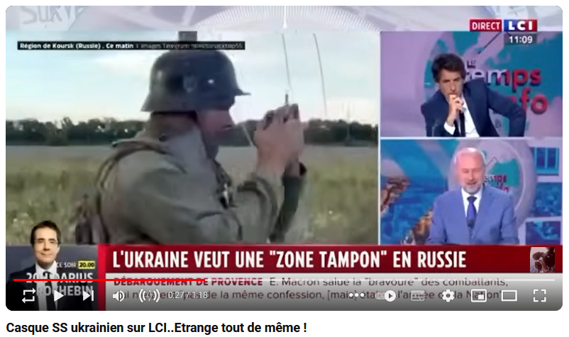 « Présentateur : Je vous voyais regarder le casque, peut-être. euh... Un peu curieux ce casque... alors, on a l’impression qu’il y a des insignes SS dessus, alors c’est peut-être le signe d’Azov qui est modifié, mais c’est vrai que c’est un peu curieux ce casque, et pas très heureux si c’est un soldat ukrainien qui se balade en Russie...